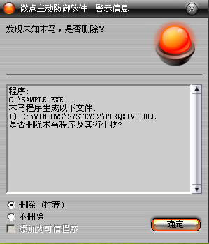 已安装使用微点主动防御软件的用户,无须任何设置,微点主动防御将自动保护您的系统免受该病毒的入侵和破坏。无论您是否已经升级到最新版本,微点主动防御都能够有效清除该病毒。如果您没有将微点主动防御软件升级到最新版,微点主动防御软件在发现该病毒后将报警提示您发现“未知木马”,请直接选择删除处理(如图1);