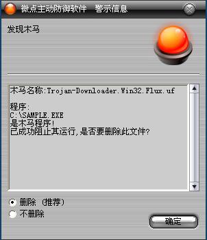 如果您已经将微点主动防御软件升级到最新版本,微点将报警提示您发现"Trojan-Downloader.Win32.Flux.uf”,请直接选择删除(如图2)。