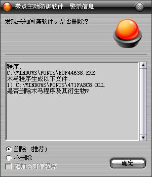 已安装使用微点主动防御软件的用户,无须任何设置,微点主动防御将自动保护您的系统免受该病毒的入侵和破坏。无论您是否已经升级到最新版本,微点主动防御都能够有效清除该病毒。如果您没有将微点主动防御软件升级到最新版,微点主动防御软件在发现该病毒后将报警提示您发现“未知间谍软件”,请直接选择删除处理(如图1);
