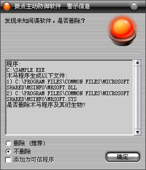 已安装使用微点主动防御软件的用户,无须任何设置,微点主动防御将自动保护您的系统免受该病毒的入侵和破坏。无论您是否已经升级到最新版本,微点主动防御都能够有效清除该病毒。如果您没有将微点主动防御软件升级到最新版,微点主动防御软件在发现该病毒后将报警提示您发现“未知间谍软件”,请直接选择删除处理(如图1);