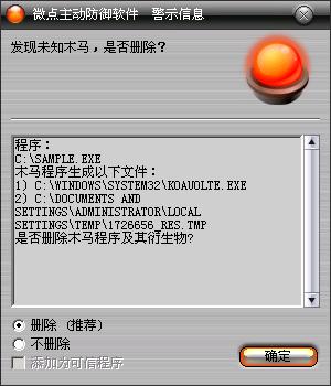 已安装使用微点主动防御软件的用户,无须任何设置,微点主动防御将自动保护您的系统免受该病毒的入侵和破坏。无论您是否已经升级到最新版本,微点主动防御都能够有效清除该病毒。如果您没有将微点主动防御软件升级到最新版,微点主动防御软件在发现该病毒后将报警提示您发现“未知木马”,请直接选择删除处理(如图1);