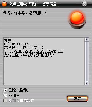 已安装使用微点主动防御软件的用户,无须任何设置,微点主动防御将自动保护您的系统免受该病毒的入侵和破坏。无论您是否已经升级到最新版本,微点主动防御都能够有效清除该病毒。如果您没有将微点主动防御软件升级到最新版,微点主动防御软件在发现该病毒后将报警提示您发现“未知木马”,请直接选择删除处理(如图1);