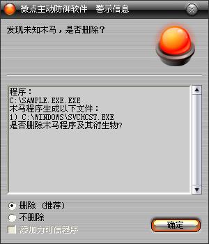 已安装使用微点主动防御软件的用户,无须任何设置,微点主动防御将自动保护您的系统免受该病毒的入侵和破坏。无论您是否已经升级到最新版本,微点主动防御都能够有效清除该病毒。如果您没有将微点主动防御软件升级到最新版,微点主动防御软件在发现该病毒后将报警提示您发现“未知木马”,请直接选择删除处理(如图1);