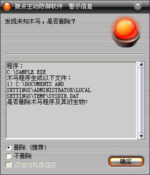 已安装使用微点主动防御软件的用户,无须任何设置,微点主动防御将自动保护您的系统免受该病毒的入侵和破坏。无论您是否已经升级到最新版本,微点主动防御都能够有效清除该病毒。如果您没有将微点主动防御软件升级到最新版,微点主动防御软件在发现该病毒后将报警提示您发现“未知木马”,请直接选择删除处理(如图1);
