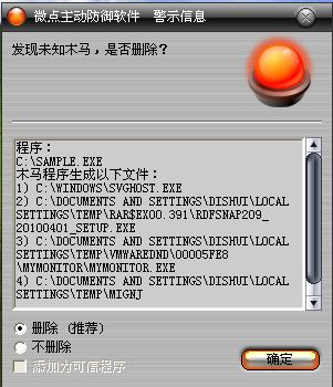 已安装使用微点主动防御软件的用户,无须任何设置,微点主动防御将自动保护您的系统免受该病毒的入侵和破坏。无论您是否已经升级到最新版本,微点主动防御都能够有效清除该病毒。如果您没有将微点主动防御软件升级到最新版,微点主动防御软件在发现该病毒后将报警提示您发现“未知木马”,请直接选择删除处理(如图1);