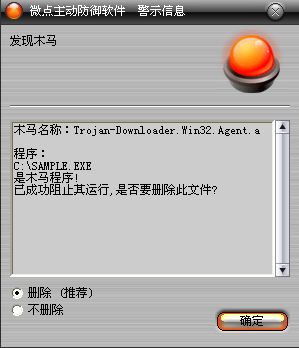 如果您已经将微点主动防御软件升级到最新版本,微点将报警提示您发现木马"Trojan-Downloader.Win32.Agent.a ”,请直接选择删除(如图2)。