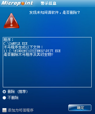 已安装使用微点主动防御软件的用户,无须任何设置,微点主动防御将自动保护您的系统免受该病毒的入侵和破坏。无论您是否已经升级到最新版本,微点主动防御都能够有效清除该病毒。如果您没有将微点主动防御软件升级到最新版,微点主动防御软件在发现该病毒后将报警提示您发现未知间谍软件,请直接选择删除处理(如图1)