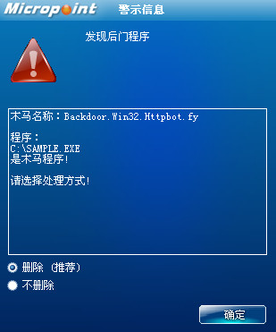 如果您已经将微点主动防御软件升级到最新版本,微点将报警提示您发现后门程序"Backdoor.Win32.Httpbot.fy",请直接选择删除(如图2)。
